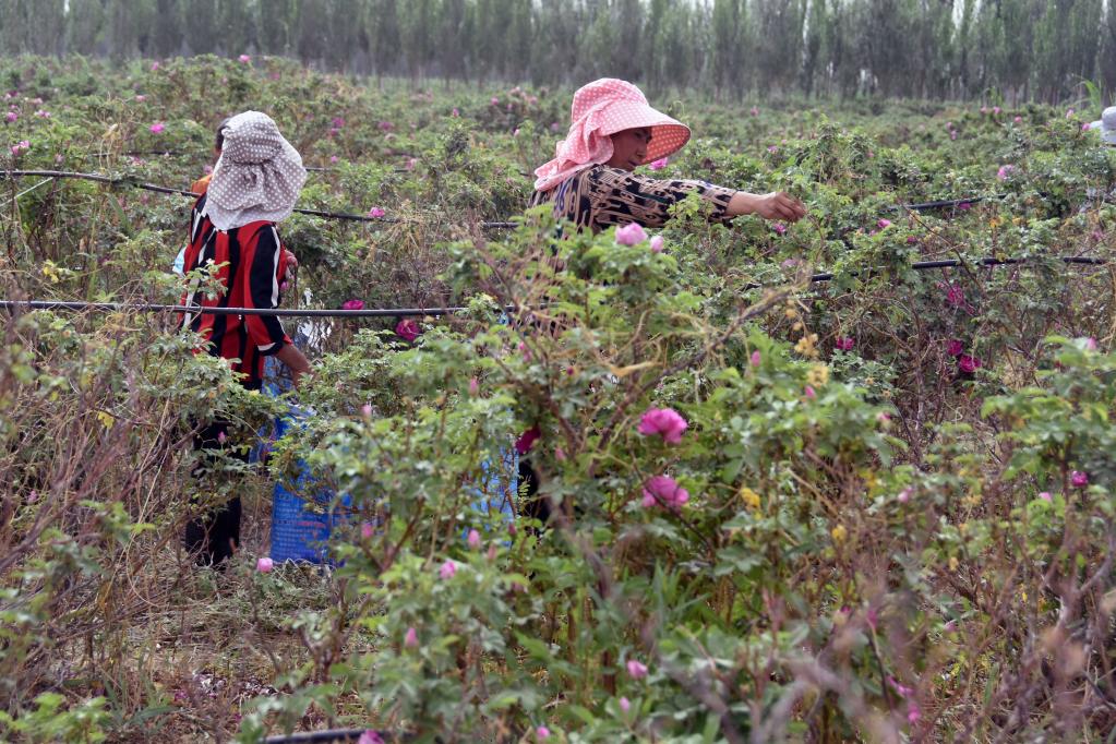 5月18日,于田瑰觅生物科技股份有限公司万亩玫瑰种植基地,周边农户正在采摘玫瑰。新华社记者 杜刚 摄