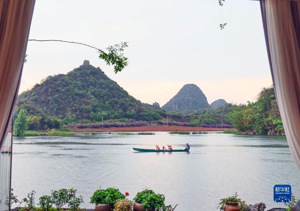 5月30日,游客乘船在普者黑景区仙人洞村游览。