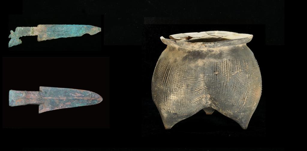 图为赵窑遗址出土的铜戈与陶鬲。(受访者供图)