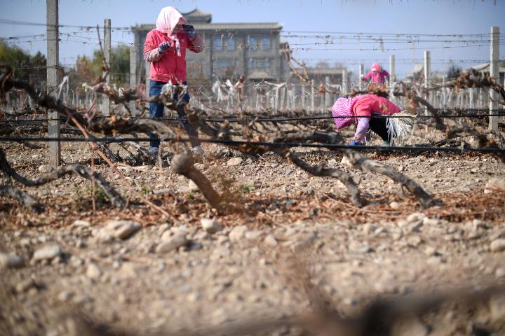 2022年11月5日,在位于宁夏银川市贺兰山东麓的蓝赛酒庄,农民进行埋藤作业。新华社记者王鹏摄
