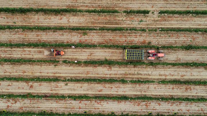 2022年9月16日,工人在宁夏银川市贺兰山东麓的沃尔丰酒庄采摘酿酒葡萄(无人机照片)。新华社记者王鹏摄