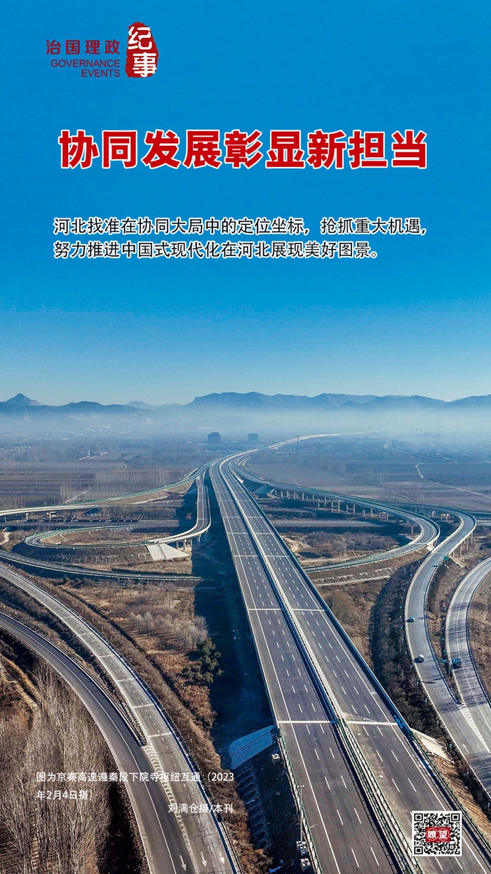 环绕京津的河北,找准在协同大局中的定位坐标,抢抓重大机遇,全面落实“三区一基地”(全国产业转型升级试验区、全国新型城镇化与城乡统筹示范区、京津冀生态环境支撑区、全国现代商贸物流重要基地)功能定位,立足自身比较优势打造一系列重点承接平台,努力打通重点区域连通京津经济廊道,在推进协同创新、产业协作中增强经济发展内生动力,持续深化公共服务共建共享造福百姓,不断推进协同发展向深度、广度拓展,努力推进中国式现代化在河北展现美好图景。