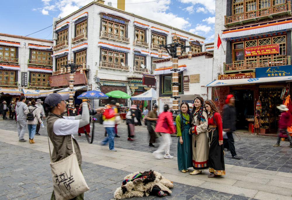 游客身着藏装在拉萨八廓街拍照留念(6月13日摄)。新华社记者 姜帆 摄
