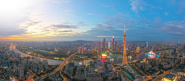 ▲“小蛮腰”广州塔与珠江两岸城市璀璨灯火交相辉映(6月10日摄)。新华社记者刘大伟摄