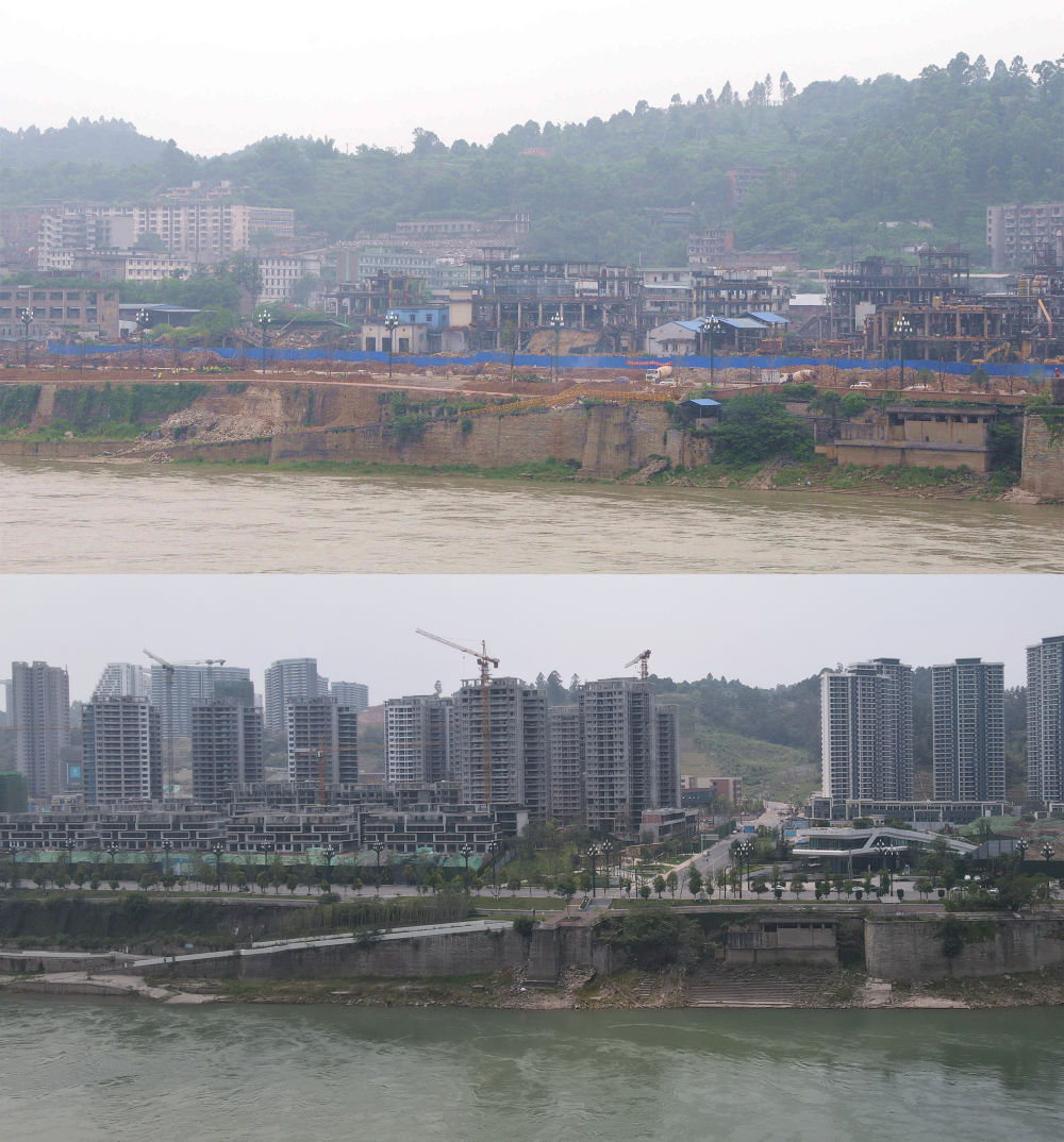 这是一张拼版照片,上图为:在距离长江干流零公里处5公里的长江北岸,宜宾天原化工厂老厂区偌大的一片厂房正被拆除(2018年6月22日新华社记者胡旭摄);下图为:在同一位置拍摄的原宜宾天原化工厂老厂区旧址今日新貌(无人机照片,2023年5月31日新华社记者刘坤摄)。新华社发