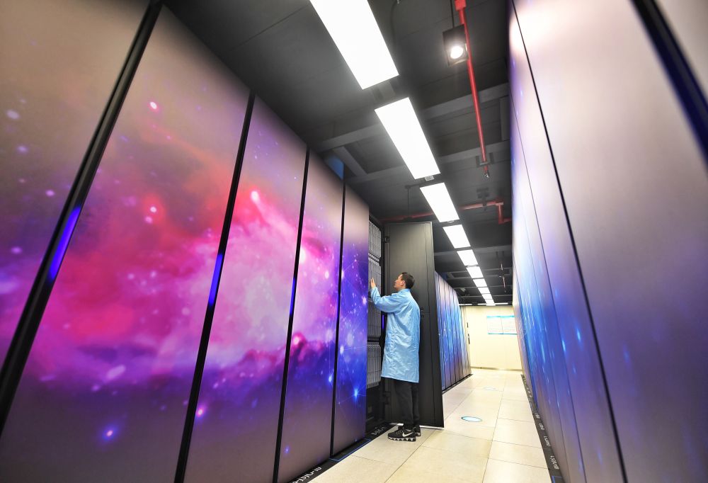 2023年2月14日,成都超算中心科研人员在巡检机房设备。新华社记者 刘坤 摄