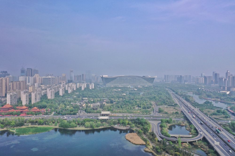 这是2022年4月6日拍摄的成都锦城湖及锦城公园(无人机照片)。新华社记者 刘坤 摄