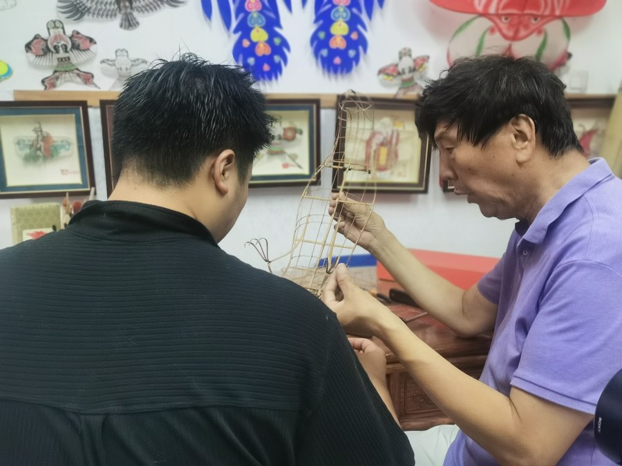 魏国秋(右)、魏博文父子正在探讨风筝制作技艺。新华社记者 刘惟真 摄