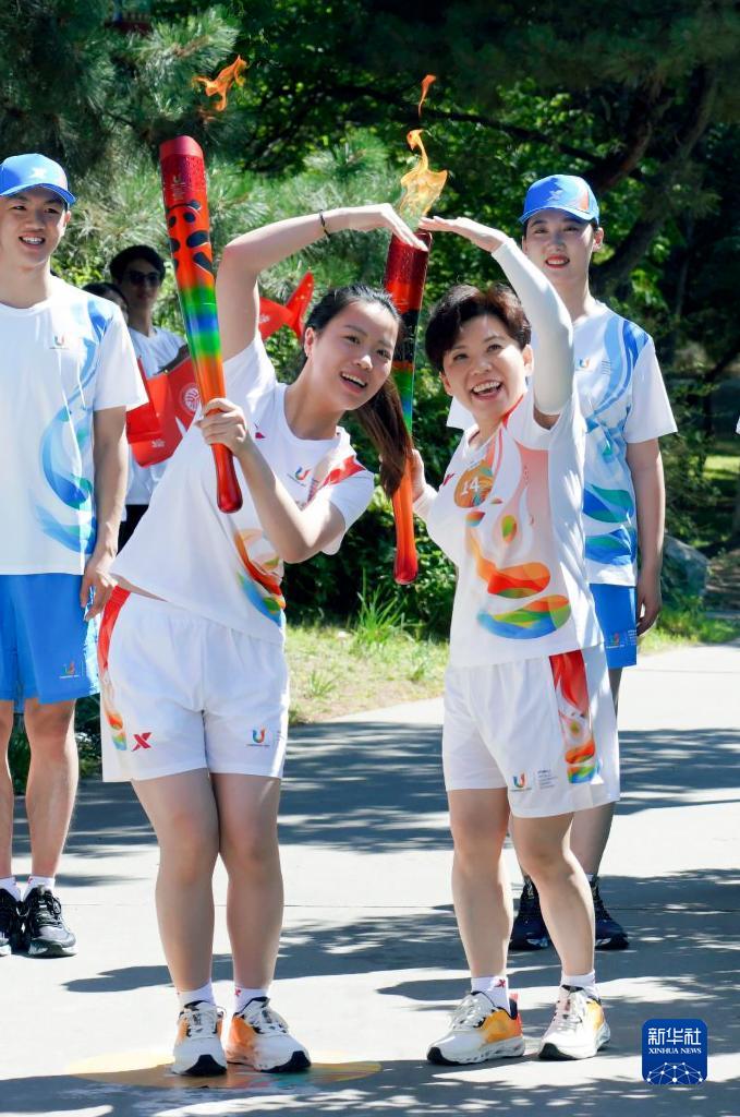 成都第31届世界大学生夏季运动会火炬传递启动仪式在北京举行,火炬手杨倩(前左)与邓亚萍(前右)在火炬传递中交接(6月10日摄)。新华社发(成都大运会执委会供图)