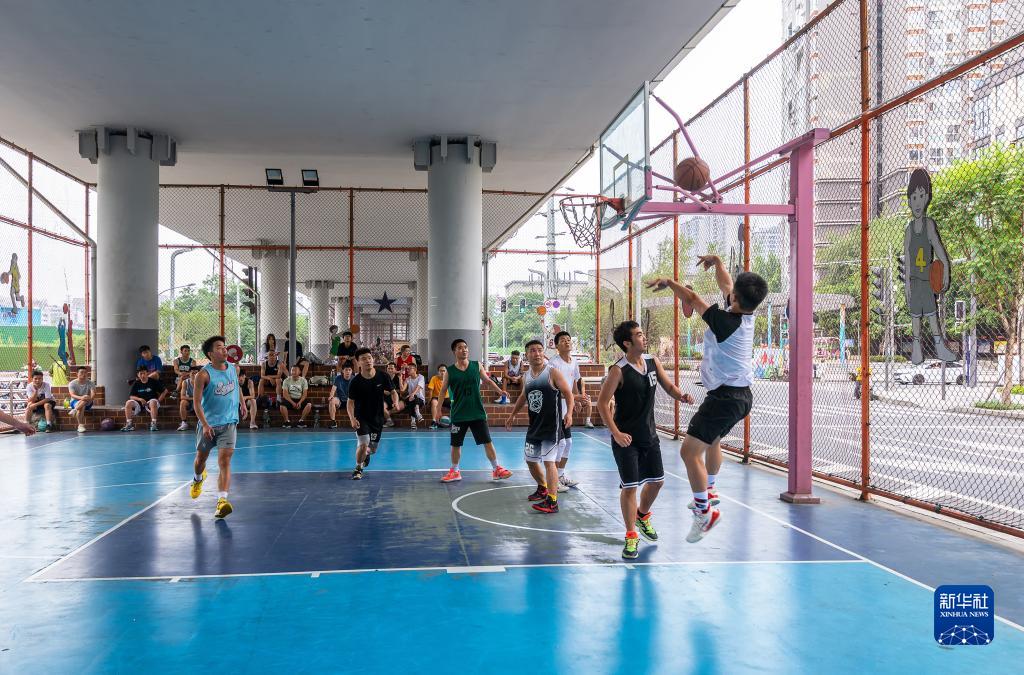 年轻人在成都市府青路立交下的运动空间打篮球(2022年6月12日摄)。新华社发(杜宁 摄)