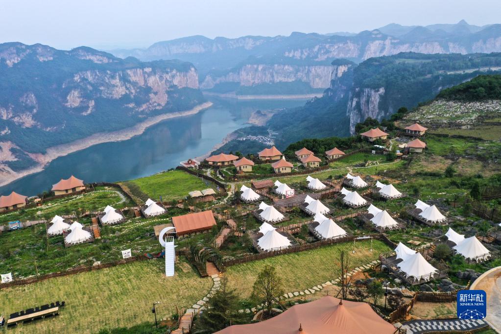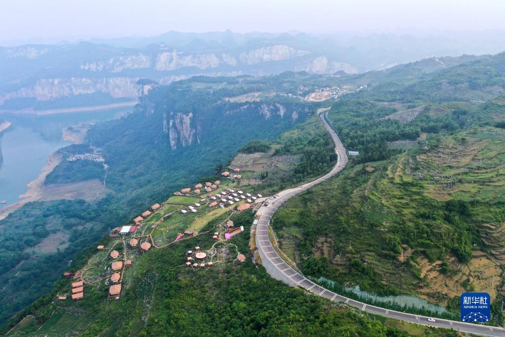 这是贵州省黔西市新仁苗族乡化屋村沿岸的露营基地(5月30日摄,无人机照片)。新华社记者 杨文斌 摄