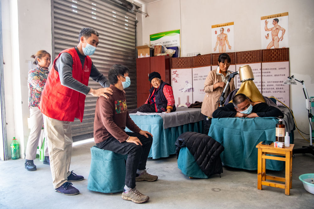 在重庆市綦江区安稳镇崇河村由当地民政部门建立的普惠养老场所“自然健康屋”,志愿者为老人提供免费理疗服务(2022年10月18日摄)。新华社记者 唐奕 摄