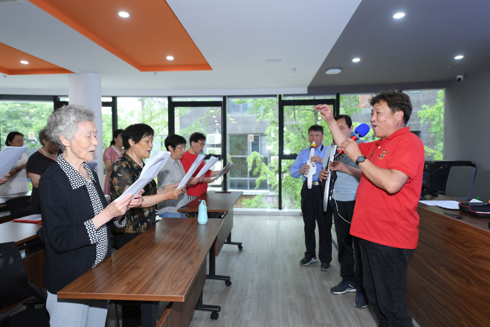 在浙江省湖州市爱山街道利民社区,一个公益组织的声乐老师和乐手带领老年居民开展合唱活动(2023年5月29日摄)。新华社记者 翁忻旸 摄