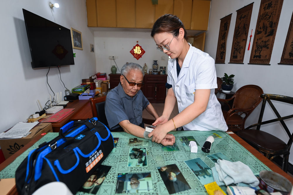 家庭医生上门为住在浙江省嘉兴市秀洲区新塍镇蓬莱社区的83岁独居老人孙志龙测量血压(2023年6月15日摄)。新华社记者 徐昱 摄