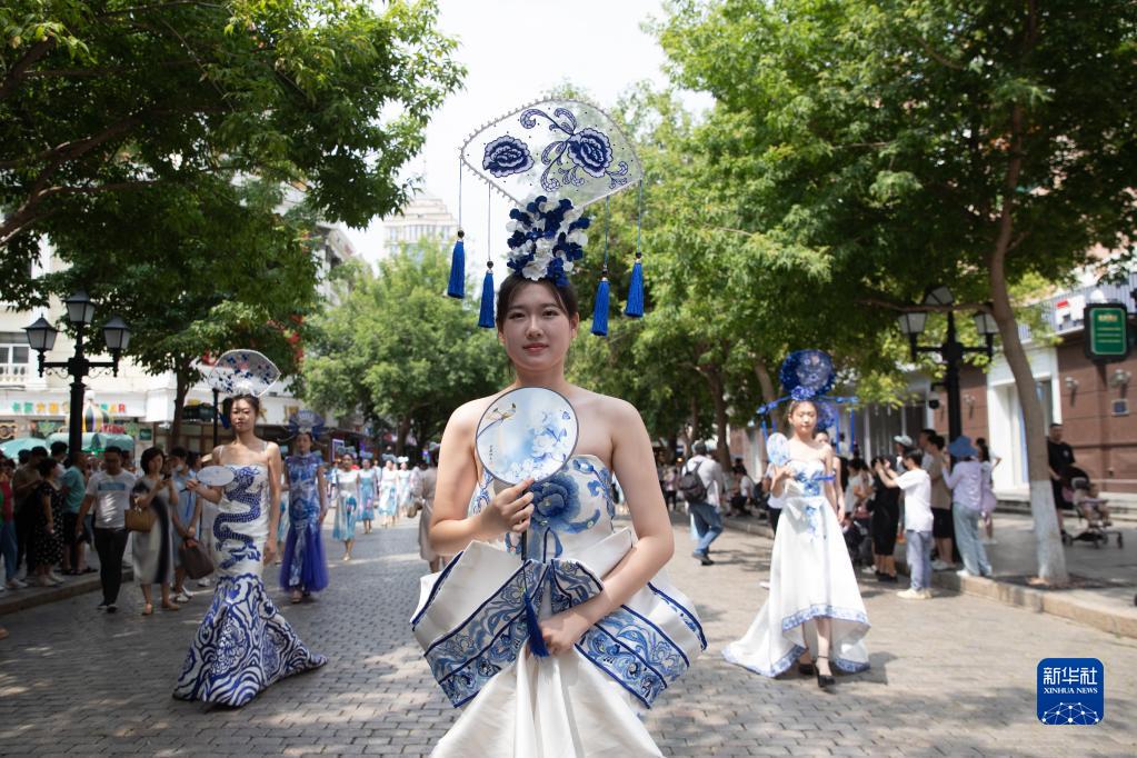 7月8日,在哈尔滨市中央大街上,人们参加巡游庆祝。新华社记者 张涛 摄