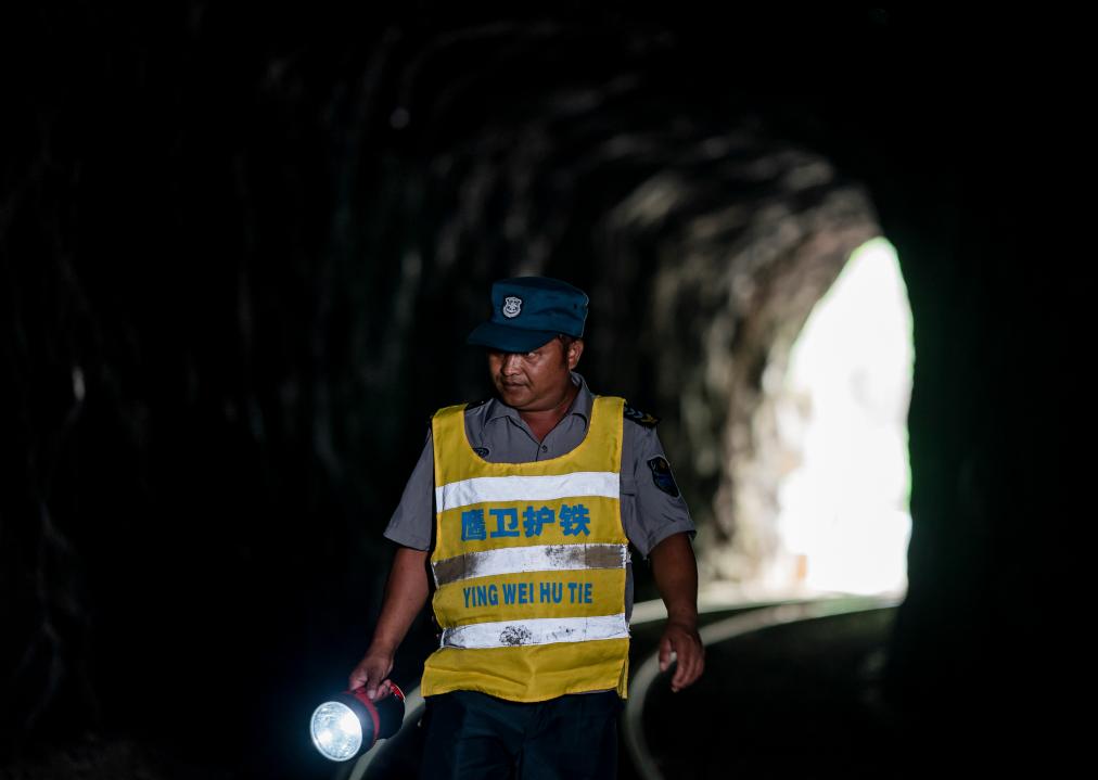 值班时,杨有光穿上工作服,拿着手电筒,穿行在隧道和桥梁间,检查铁轨特别是“人字桥”上的各种铁路设施的安全,这是他再熟悉不过的工作内容。火车驶经“人字桥”前后,须从两个隧道穿过。为保障行车安全,杨有光不仅要检查桥面状况,还需要精准把握隧道内的情况。他要穿行在隧道内外,巡查大桥整体状况,沿着陡峭的阶梯走到桥下,察看零部件状况。