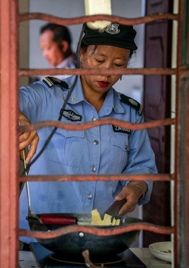 ↑杨有光的妻子在宿舍厨房做饭。