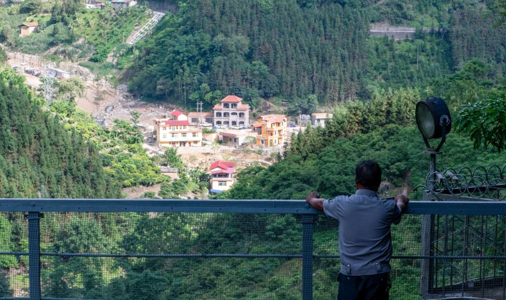 ↑杨有光站在桥头,远处左侧的房子是他山下的家。