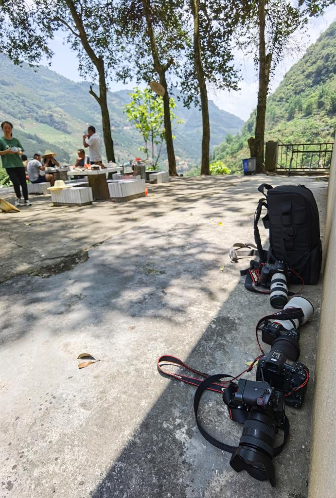 ↑采访间隙,记者在隧道旁的空地上吃了午饭。因天气炎热,只好将相机放在了阴凉处。