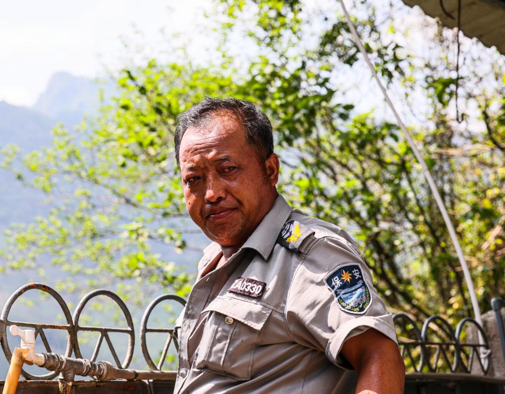 走出“人脸隧道”踏上“人字桥”,透过相机取景器,记者看到在另一端桥头的崖壁上,一个身着铁路安保制服的中年男人正在捡拾垃圾,这也是守桥人第一次进入记者的镜头。