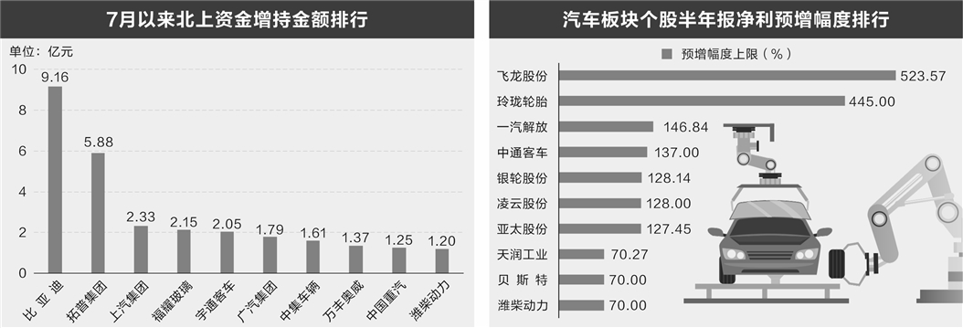 北上资金也青睐汽车板块。按照区间成交均价计算,7月以来,北上资金增持超亿元的汽车板块个股有13只,其中比亚迪、拓普集团、上汽集团、福耀玻璃、宇通客车等个股增持参考金额均超2亿元。