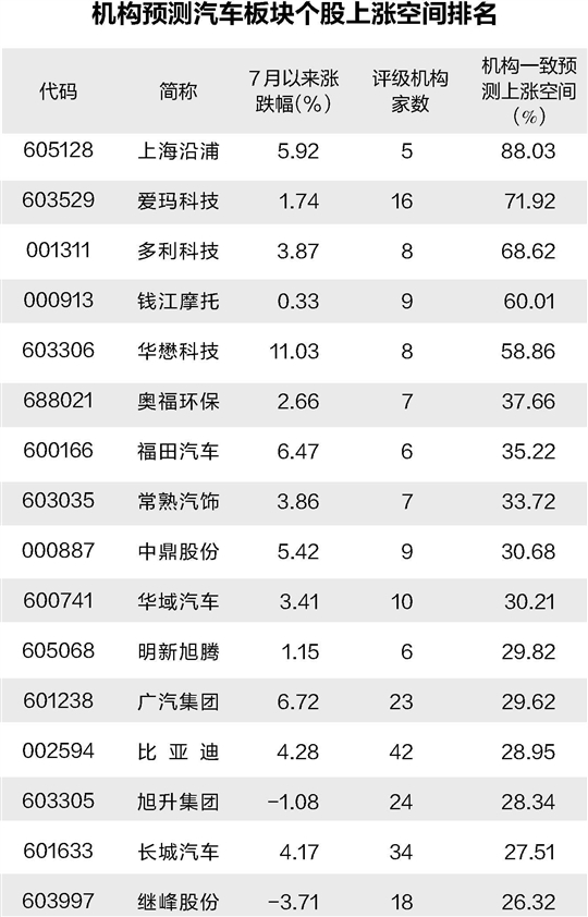 比亚迪也是机构关注度最高的个股,有多达42家机构评级。另外,长城汽车、伯特利等个股均有30家以上机构评级。从上涨空间来看,按照5家及以上机构一致预测,最新收盘价与一致目标价相比,上海沿浦、爱玛科技、多利科技等10股上涨空间逾30%。其中,上海沿浦上涨空间高达88%,位居首位。(记者 陈见南)