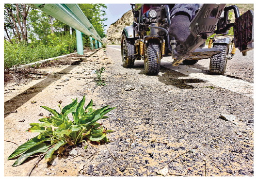 采访期间,我陪胡少杰去散步,寻访他想看的山、水、野草、闲花。自从有电动轮椅车后,胡少杰就迷上了外出。“不知道去哪,也无需知道”,他只尽情享受“淡淡花草的香味,归巢鸟儿的身影”,听听“白发翁媪们谈论的家长里短”。