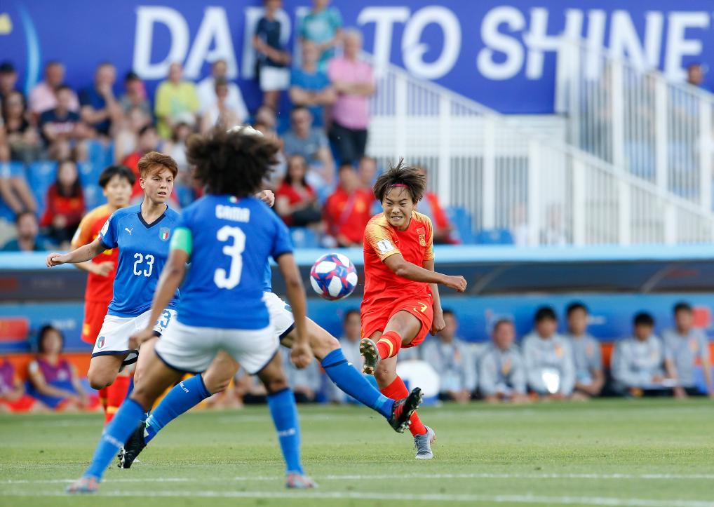 2019年6月25日,中国队球员王霜(右一)在比赛中射门。当日,在法国蒙彼利埃举行的2019年国际足联女足世界杯16强赛比赛中,中国队以0比2不敌意大利队,无缘八强。新华社记者丁旭摄