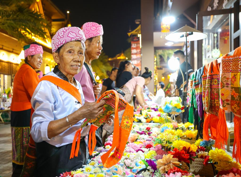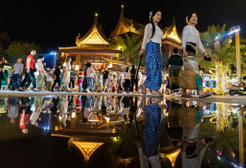 在云南芒市,夏日夜晚的傣族古镇街头,灯光与月色交织,富有少数民族特色的建筑、服饰、舞蹈、美食让游客流连忘返。有的游客换上傣装,沉浸式体验古傣风情;泡鲁达、烤饭团、手抓饭,游客一站式品尝地方特色美食;慢轮傣陶、傣族织锦、傣银,持守匠心的手艺人展示着魅力独具的非遗文化。