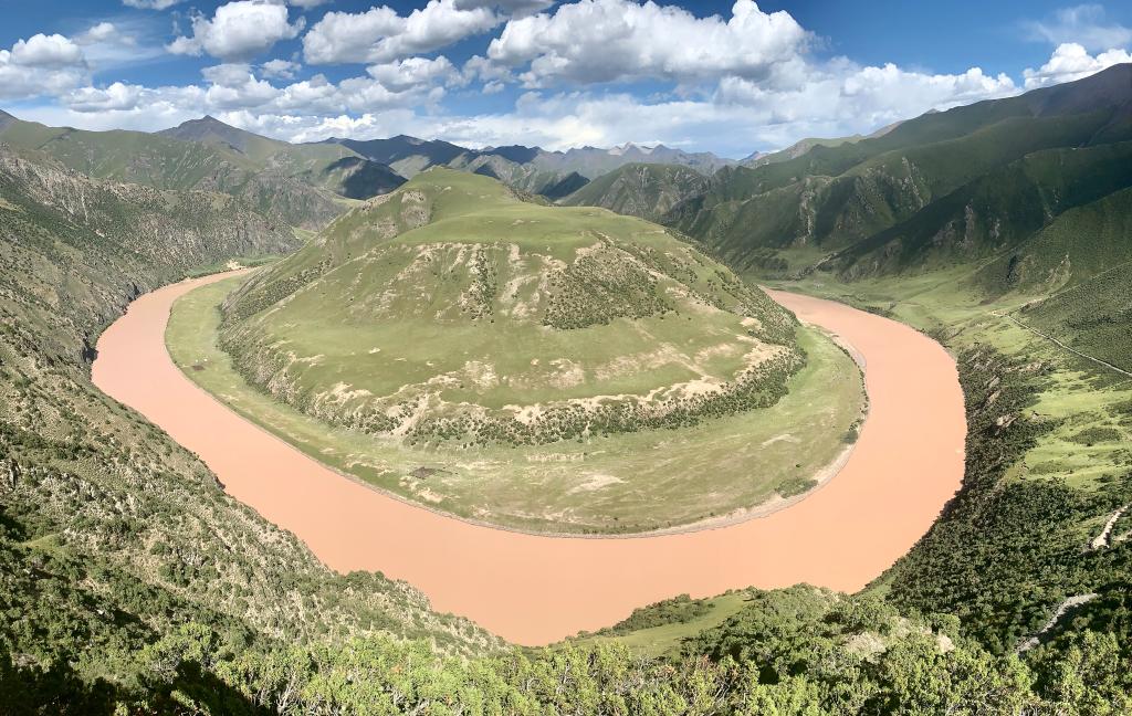 长江上游,通天河在青海省玉树藏族自治州治多县立新乡叶青村环绕山体构成一个完美的弧度,形成了今日的网红打卡地——万里长江第一湾。这里地形奇异,山水融合,有着宜人的自然风光。