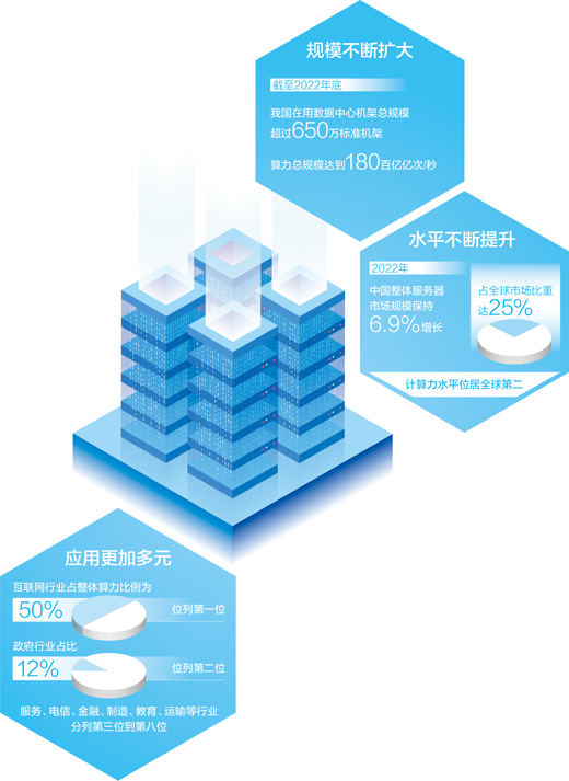 《2022—2023全球计算力指数评估报告》显示,2022年,中国整体服务器市场规模保持6.9%的正增长,占全球市场比重达25%,计算力水平位居全球第二。近年来,我国算力产业蓬勃发展,融合应用深度不断拓展。算力作为数字经济时代的关键生产力,有效赋能千行百业数字化转型,推动新兴产业发展。