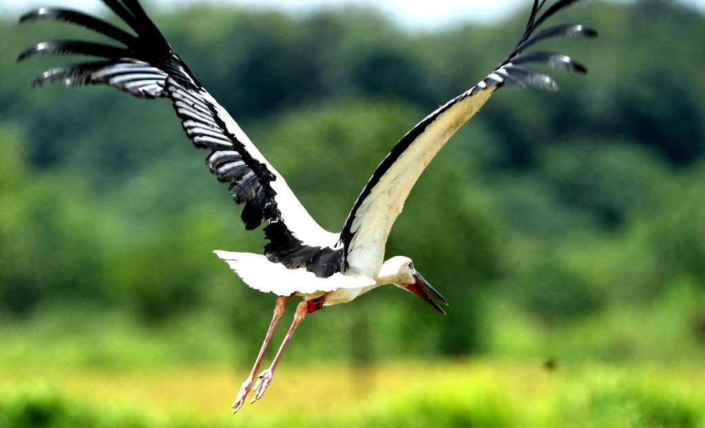 ↑在江西省进贤县钟陵乡,被救治康复后的东方白鹳向田野飞去(7月20日摄)。