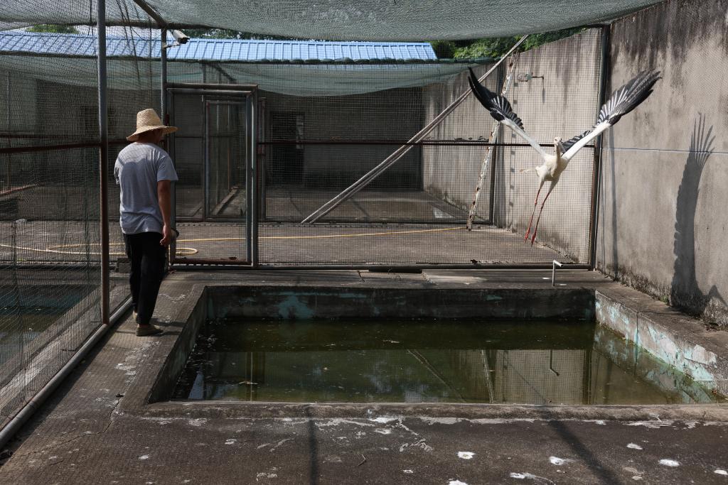 ↑在江西省野生动物救护中心,饲养员给被救助的东方白鹳喂食完毕后,准备离开(7月15日摄)。