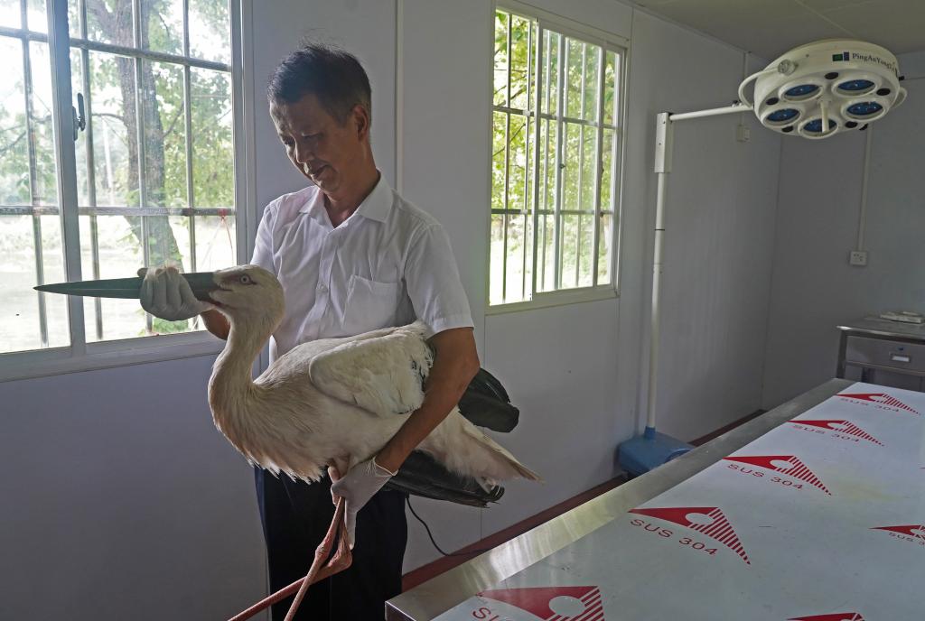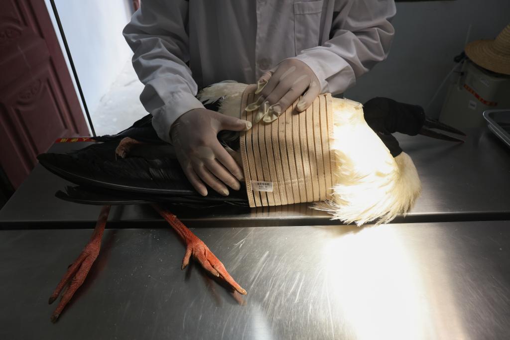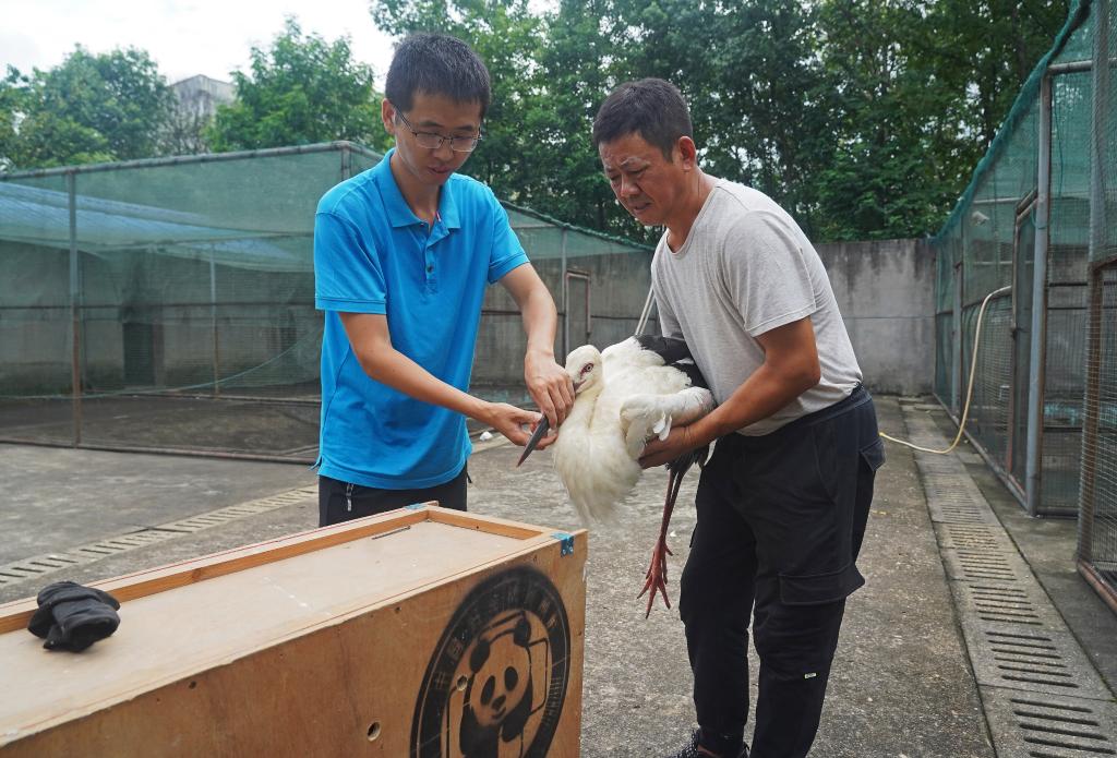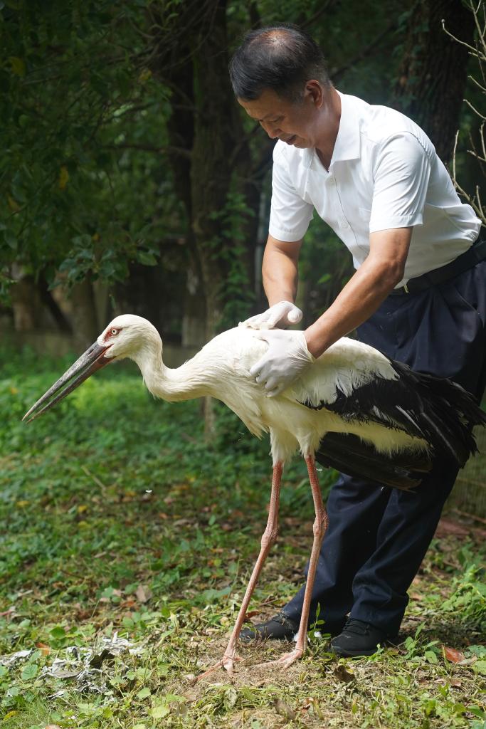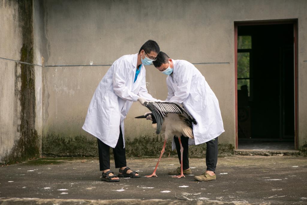 ↑在江西省野生动物救护中心,工作人员在检查东方白鹳翅膀的康复情况(7月15日摄)。