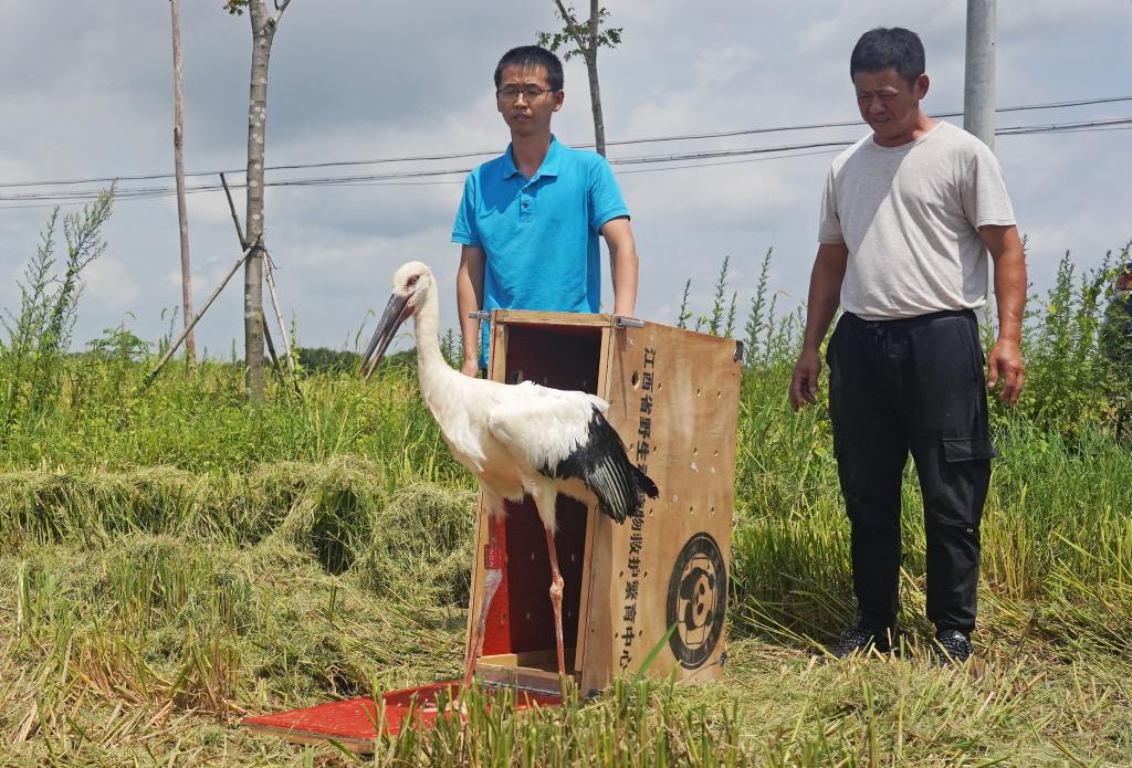 ↑在江西省进贤县钟陵乡,工作人员将救治康复后的东方白鹳放归自然(7月20日摄)。