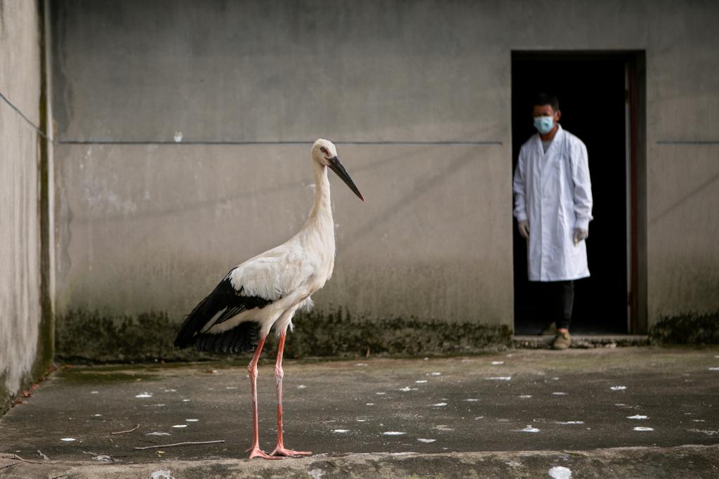 ↑在江西省野生动物救护中心,工作人员在观察东方白鹳的康复情况(7月15日摄)。