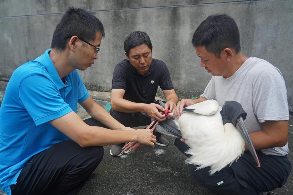 ↑在江西省野生动物救护中心,汪志如(中)和工作人员一起为一只即将放飞的东方白鹳佩戴调整GPS跟踪器(7月20日摄)。