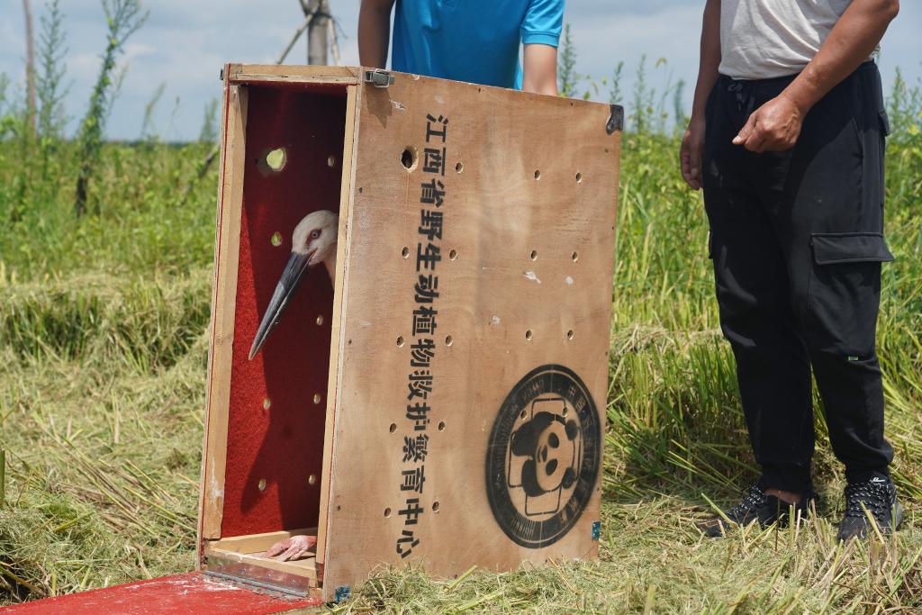 7月20日,在江西省进贤县钟陵乡,一只被救治康复后的东方白鹳将信将疑地走出木箱子,回头看了看守护在它后面的工作人员,适应一段时间后,展翅向田野飞去……