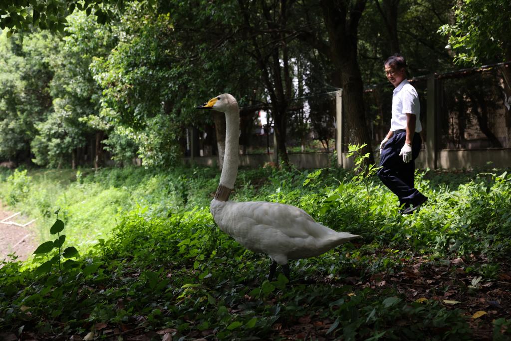 ↑在位于江西省永修县的江西鄱阳湖国家级自然保护区吴城保护站,王小龙在观察一只收治的天鹅(7月15日摄)。