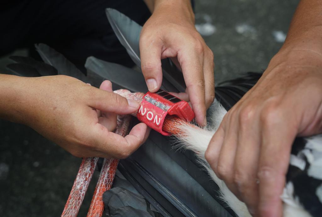 ↑在江西省野生动物救护中心,工作人员正在为一只即将放飞的东方白鹳佩戴调整GPS跟踪器(7月20日摄)。