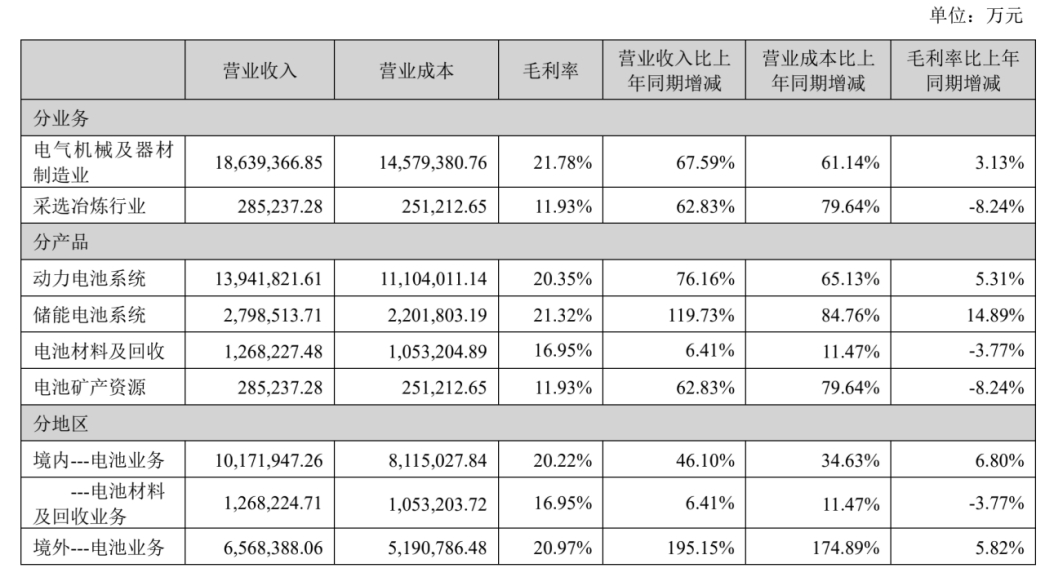 宁德时代表示,报告期内,公司销售境外的主要产品为电池系统,公司境外收入6,716,893.71万元,占本期营业收入35.49%,主要为随着公司海外业务持续拓展,前期海外客户定点陆续交付,因此境外销售收入相应增长。