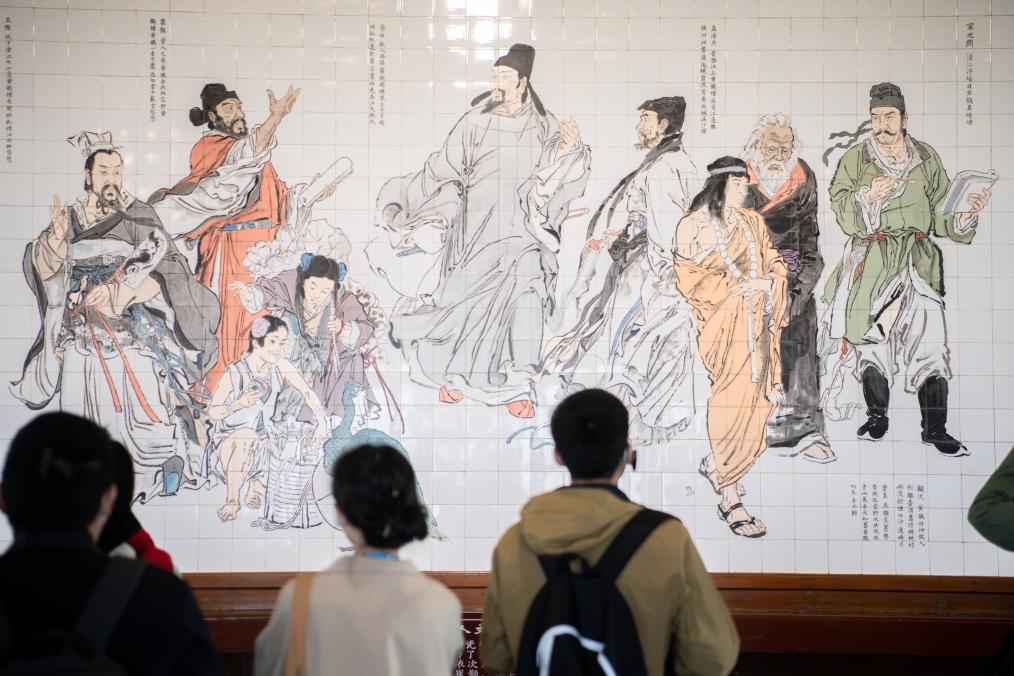 游客在黄鹤楼内参观文化名人绣像画。新华社记者伍志尊 摄
