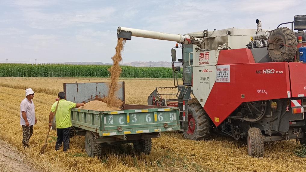 乌拉特中旗乌加河镇农户正在收获小麦。新华社记者 李云平 摄
