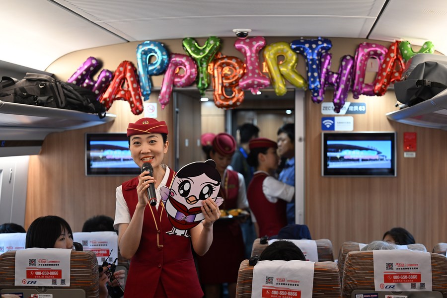 8月1日,天津客运段的乘务人员在京津城际列车上给旅客介绍文创产品“喜十五”。新华社记者 李然 摄