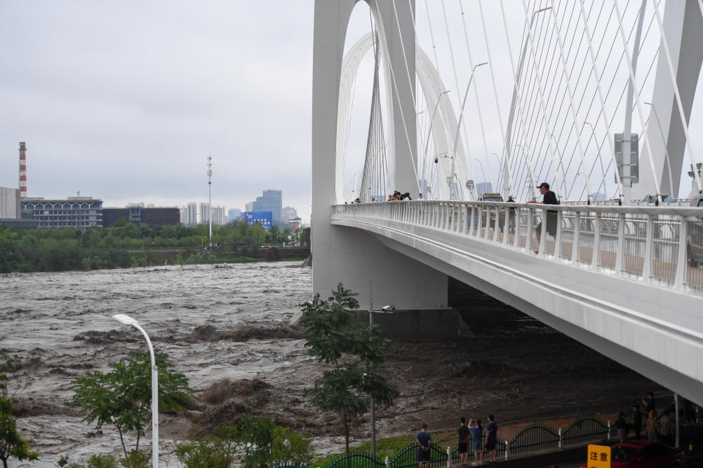 这是7月31日在北京市新首钢大桥上拍摄的永定河水流。 新华社发(鞠焕宗 摄)