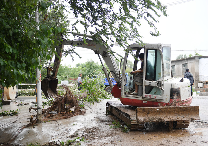 8月1日,在北京市房山区青龙湖镇上万村,工作人员清理倒伏树木。 新华社发(张晨霖 摄)