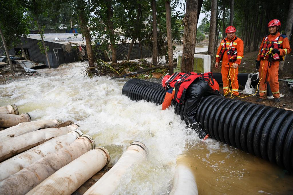 8月6日,在河北省涿州市刁窝镇东张村,唐山消防救援支队队员正在进行排涝作业。新华社记者牟宇摄