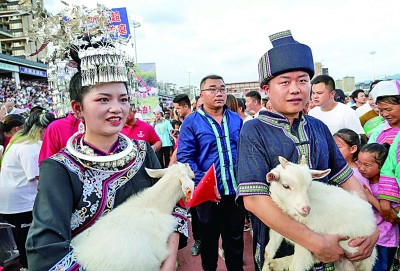 村民抱着当地国家地理标志产品——塔石香羊入场。王炳真摄/光明图片