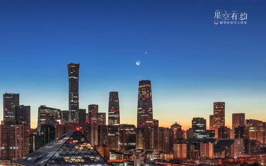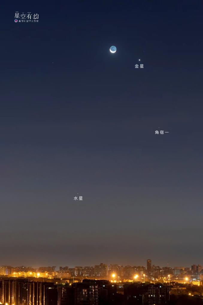 北京市天文摄影爱好者汤波2020年11月13日在北京拍摄的金星、角宿一、水星和弯月。(本人供图)