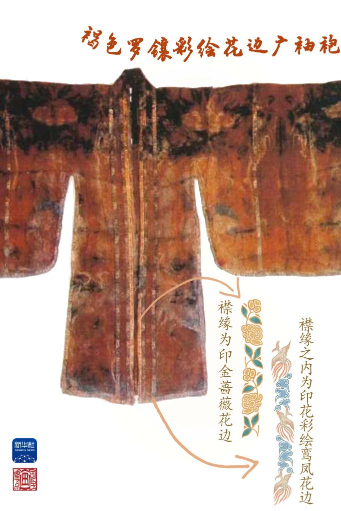 这件褐色罗镶彩绘花边广袖袍出土自福州南宋黄昇墓,现藏于福建博物院。这件广袖袍以罗制成,合领对襟开叉,身长过膝,领、襟、袖缘以及下摆缘都缝有花边一道。袍上两种花边极其精美,襟缘为印金蔷薇花边,泥金印出蔷薇花、叶轮廓,叶内填彩;襟缘之内为印花彩绘鸾凤花边,间饰以流云,出土时,鸾凤呈橘红、灰白色,流云呈浅蓝色。
